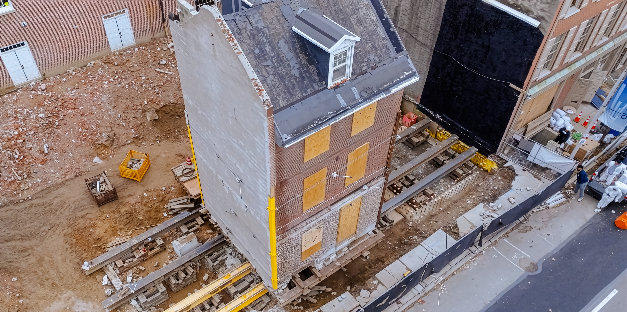 Historic preservation in motion: a circa 1760 rowhouse is carefully relocated by Domus, moving 48 feet to maintain the integrity of the Old City streetscape while making way for new supportive housing at Old First House.